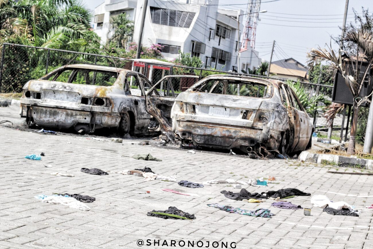 Lekki was on fire, or at least Circle Mall is still burning at the time we got there around 2pm. The streets was a mess filled with filth and burnt tyres at every point. In Lekki phase one, so many personal businesses, banks had been vandalised and properties stolen. It’s been reported that banks, local government secretariats, police stations, the Palace of the Oba of Lagos, Shoprite in Ajah and Surulere, Nigerian Ports Authority head office, the governor mother’s house at Akerele, VIO/Federal Road Safety Corps’ offices at Ojodu, magistrates’ courts at Igbosere, TVC station, the Nation Newspapers office, BRT station and buses and so many others have been burnt down in the last 48 hours.